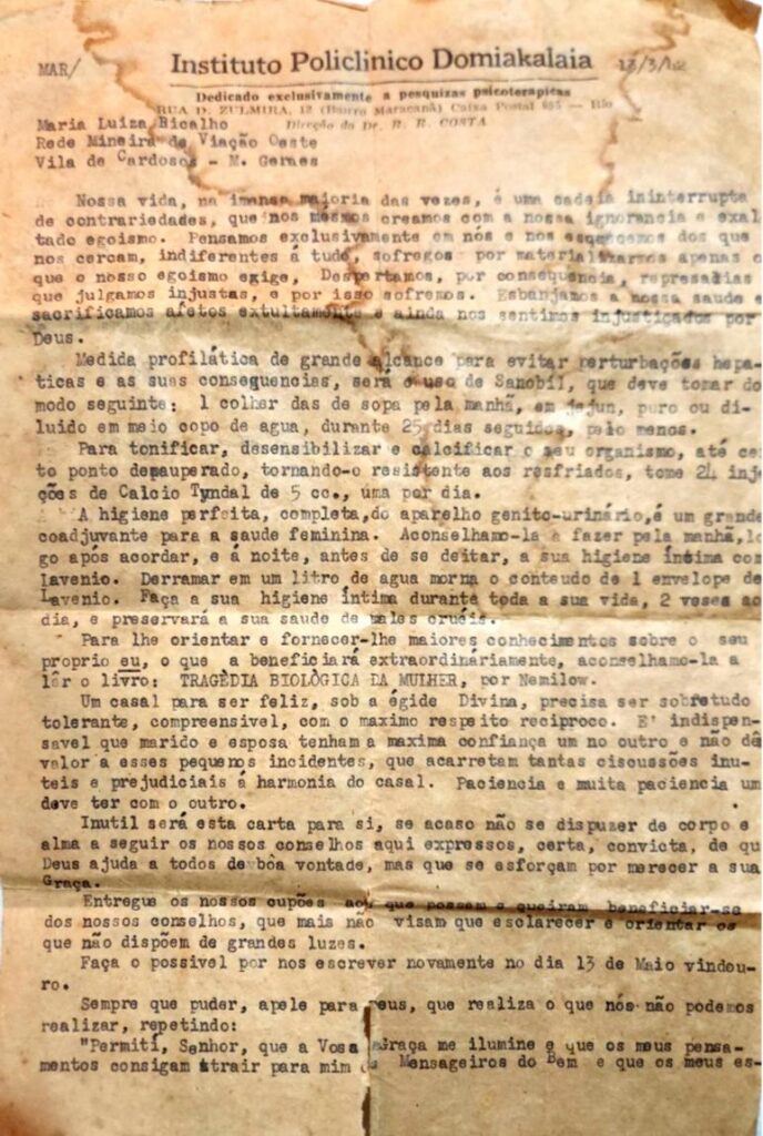 Recentemente uma das minhas irmãs encontrou dentro de uma latinha uma receita médica datada de 1942. Foi prescrita para a minha avó. Mais que uma receita, é, na verdade, uma carta datilografada que retrata a época. Além da indicação dos medicamentos que Vovó deveria usar, traz também reflexões sobre como manter a harmonia no casamento, orientações religiosas e uma recomendação médica insólita: para entender sua sexualidade e saúde, que lesse o livro “A tragédia biológica da mulher”.