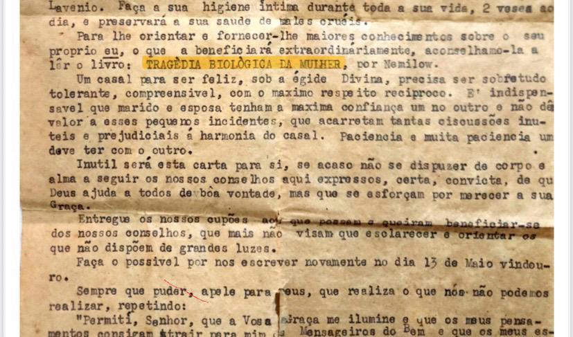Vovó seguiu à risca a orientação da carta do médico: certamente usou todos os medicamentos prescritos, manteve harmônico o casamento que ultrapassou as Bodas de Ouro e comprou o livro. Esse acabou herdado pela minha mãe e foi guardado a sete chaves, longe dos olhares e curiosidades da prole.