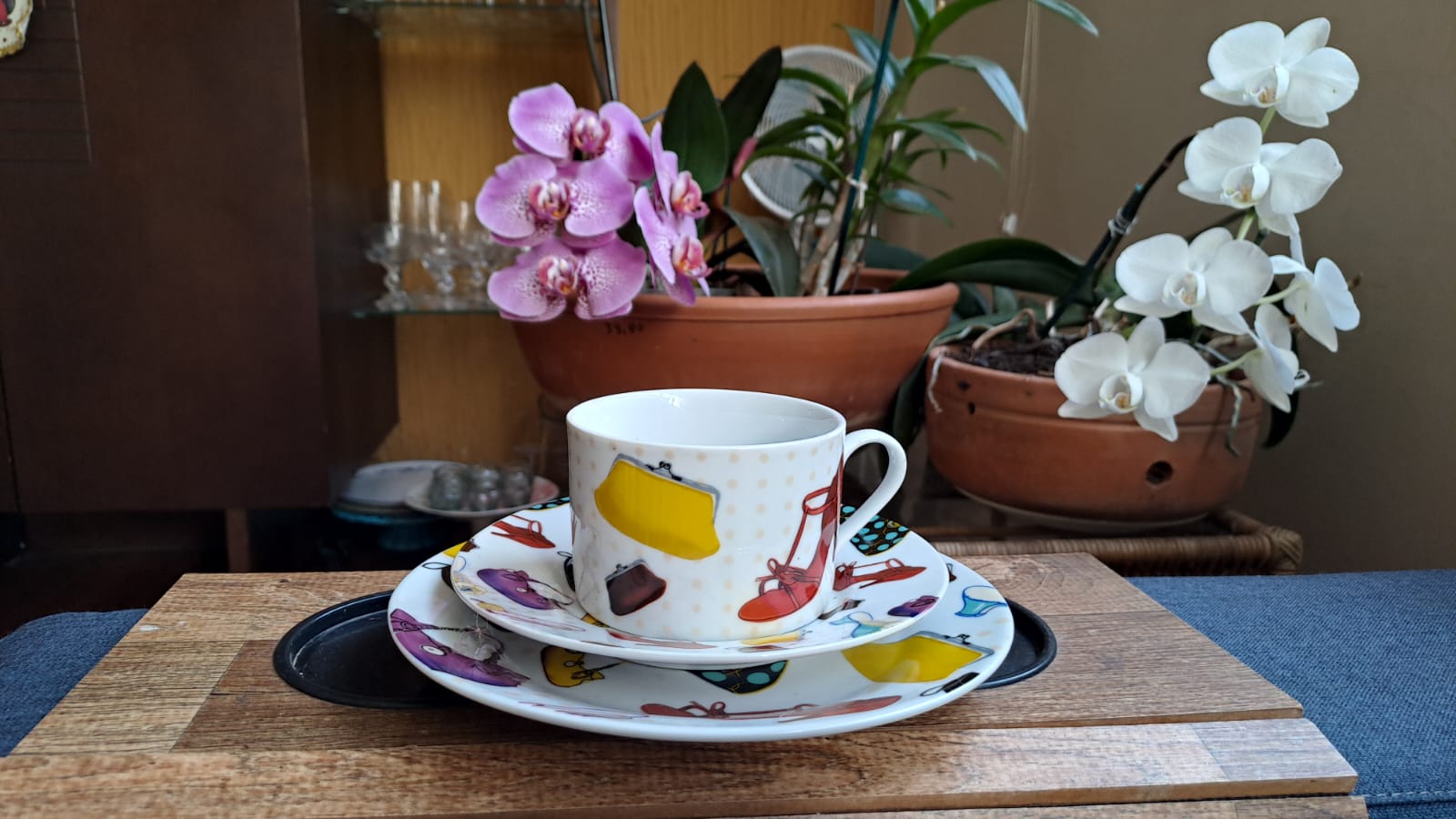 Você reparou nas louças que usei dia desses? Fiquei tão encantada que até postei nas redes sociais. São xícaras, pires e pratos de bolo. A estampa traz bolsas, sapatos e vestidos. Lindas! Bem femininas. Tenho há anos. Ficam encaixotadas. Só saem para brilhar em ocasiões especiais. Ou não. Dessa vez, ganharam protagonismo porque eu queria enfeitar a tarde da minha família. Para compor, passei um cafezinho. também servi um bolo de banana. Preparei enquanto a casa estava silenciosa e todos tiravam um cochilo.
